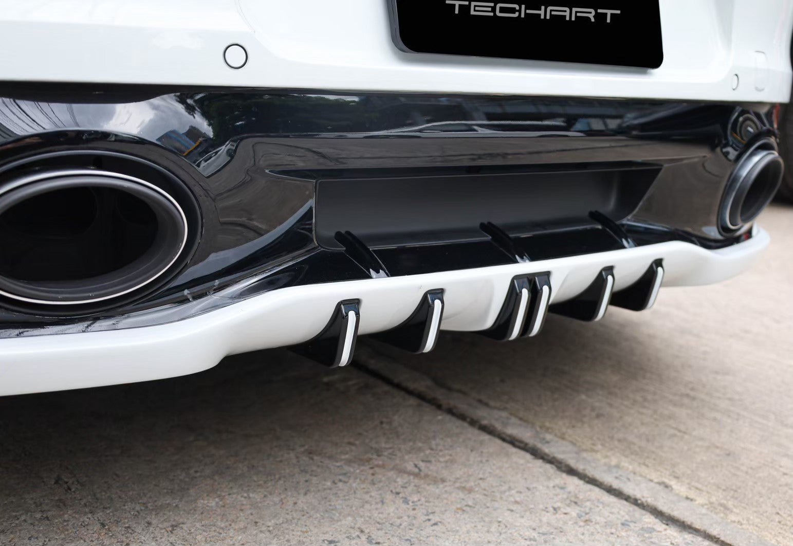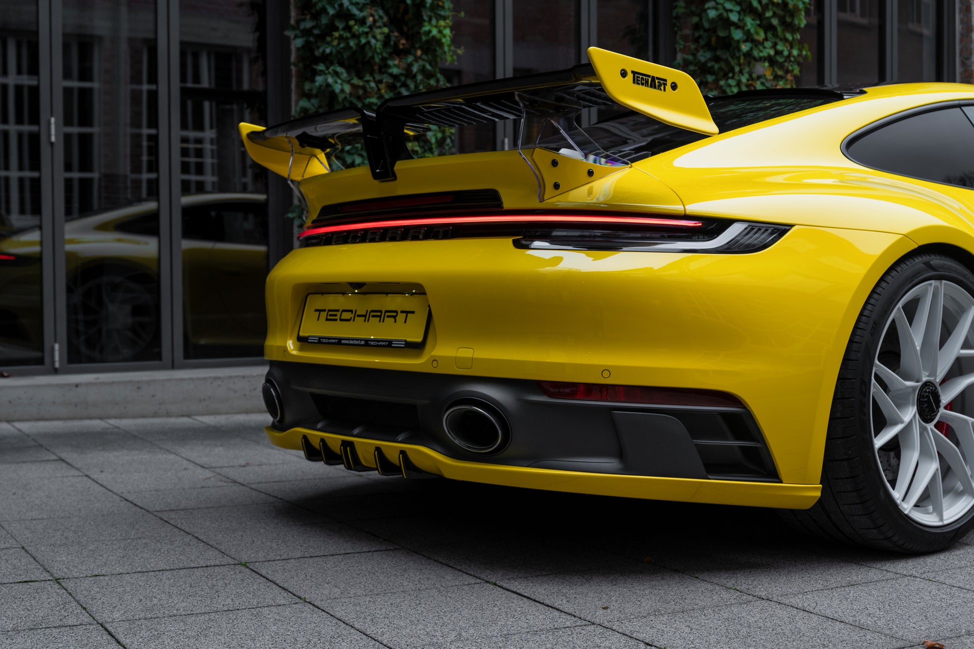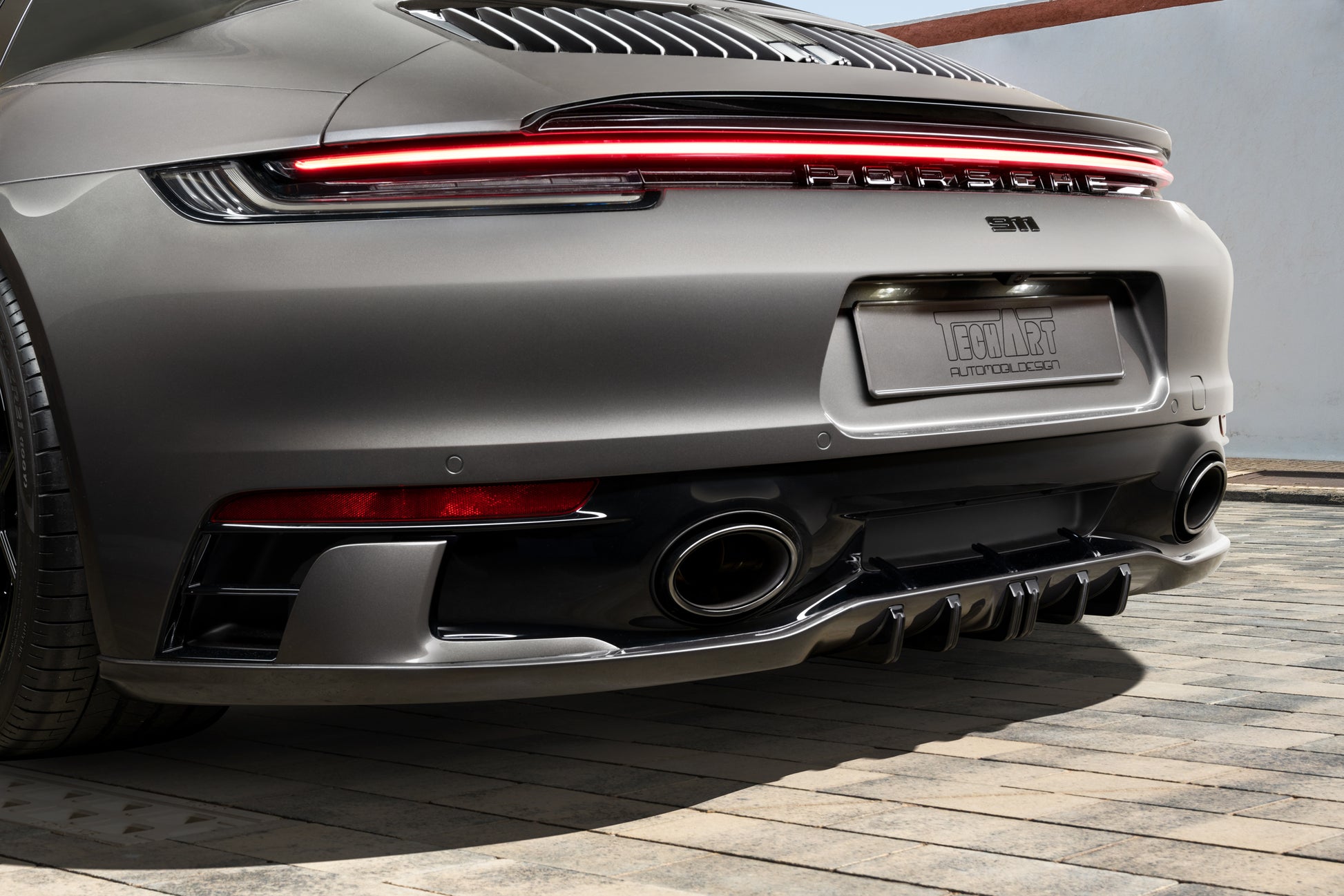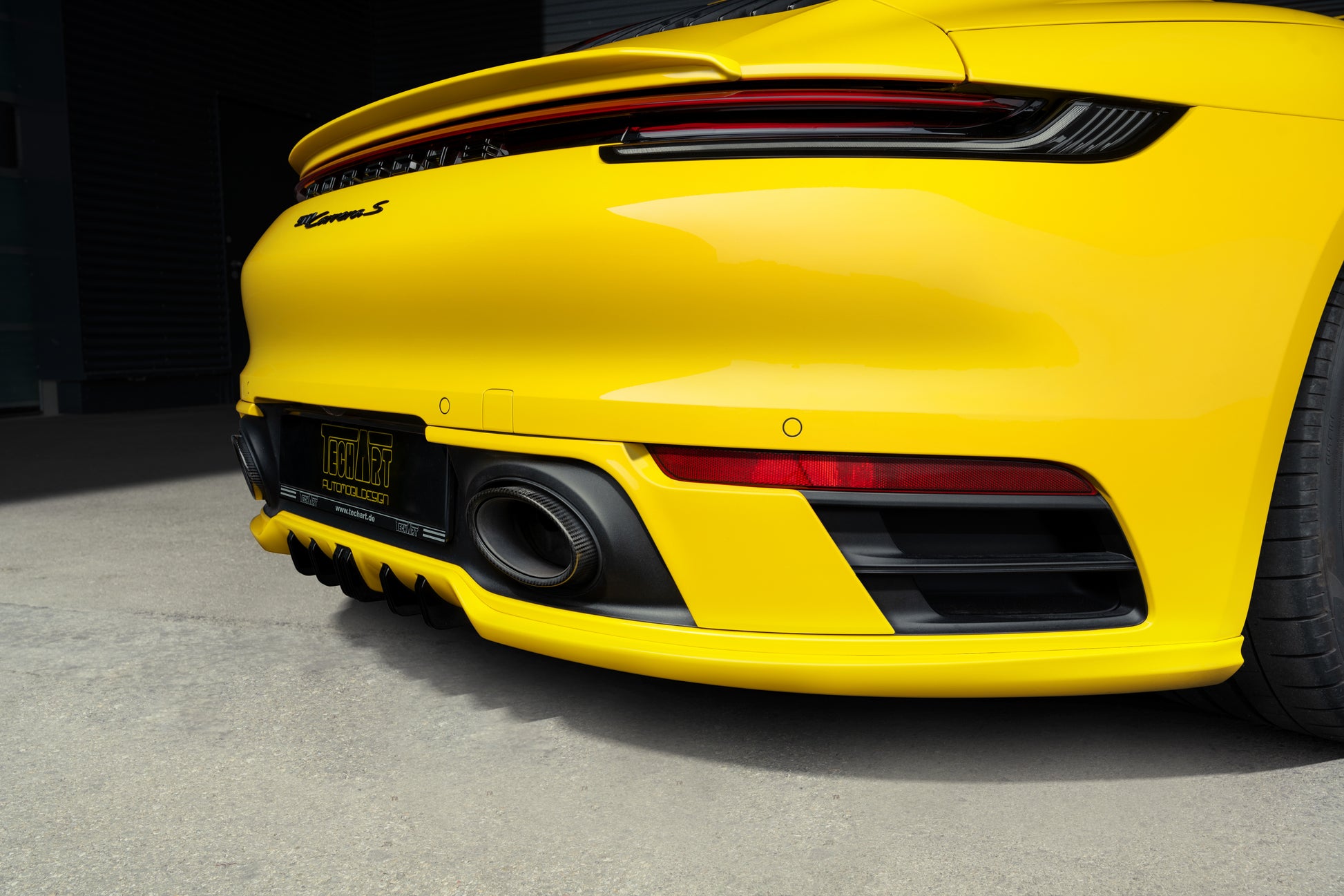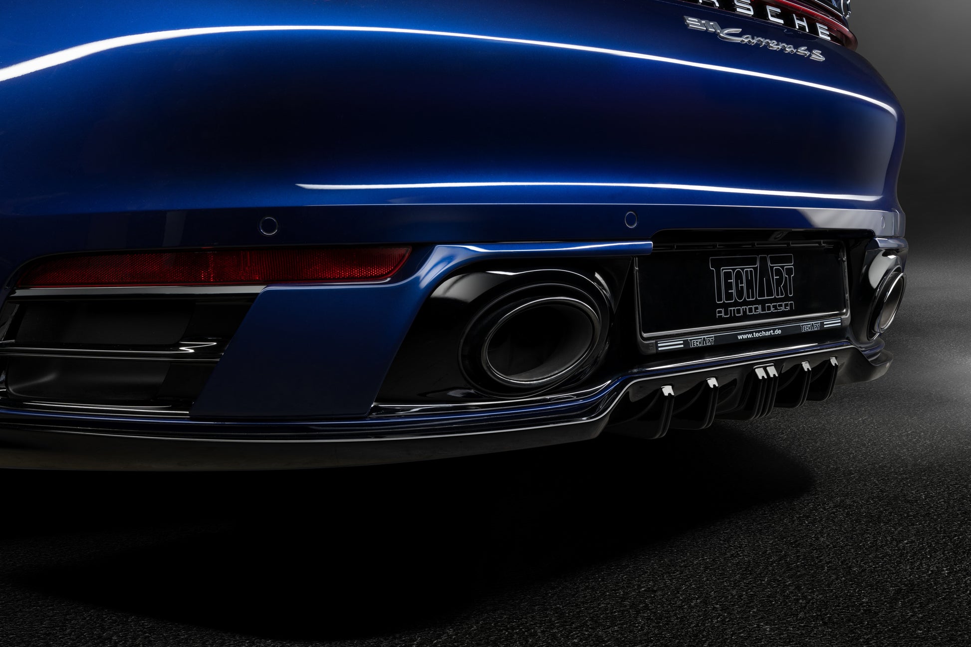 The lower rear is dominated by the Techart Rear Diffusor, which spreads to both sides of the rear apron. Five diffusor fins help to reduce the aerodynamic lift and can be individually color matched.