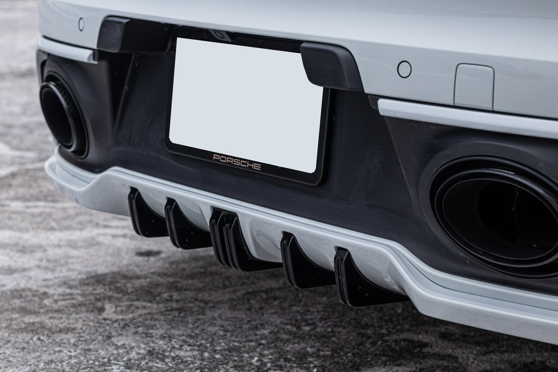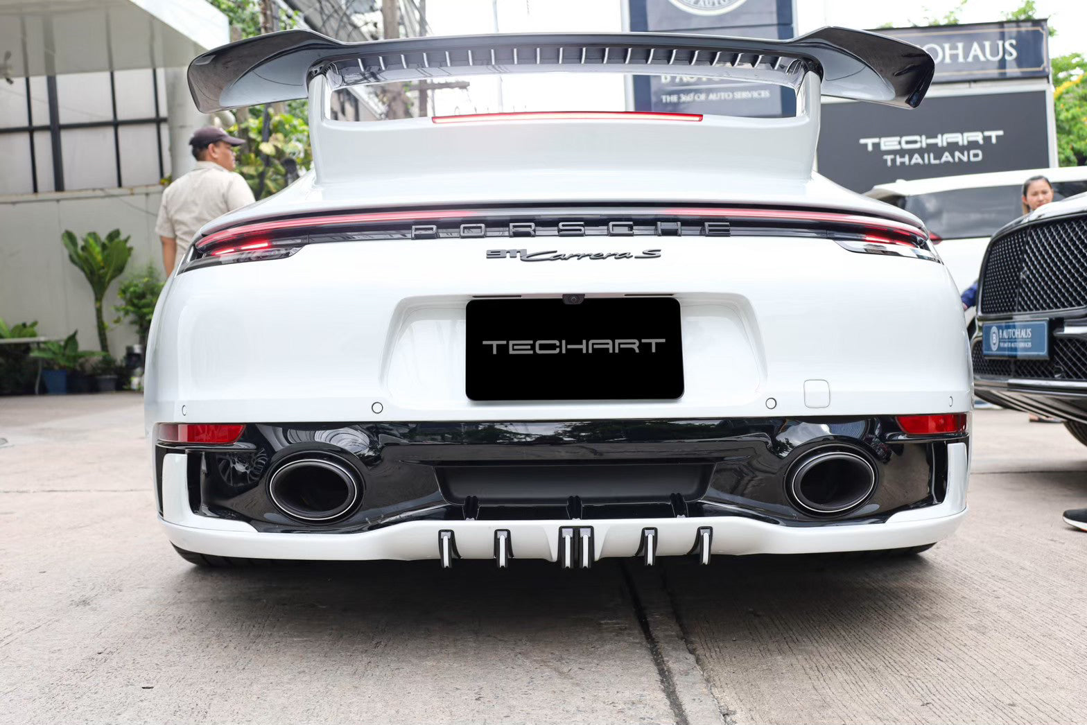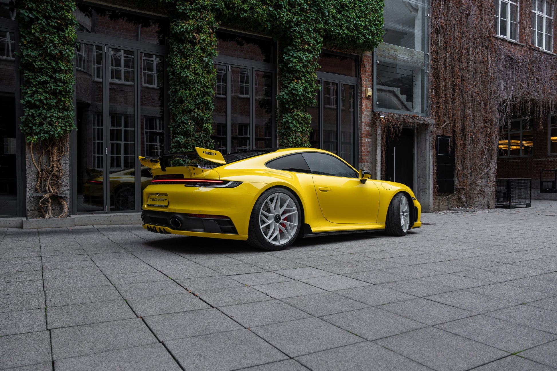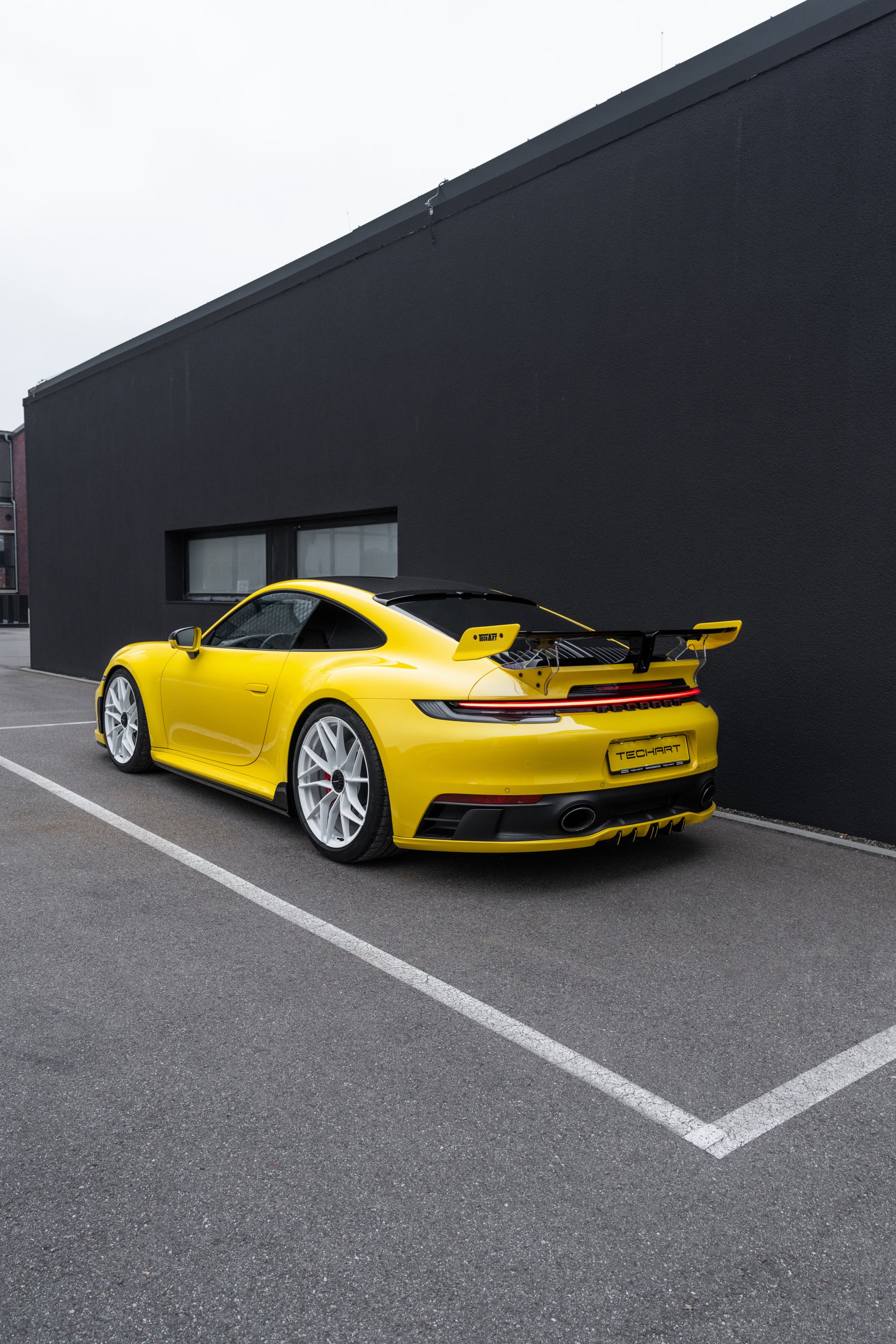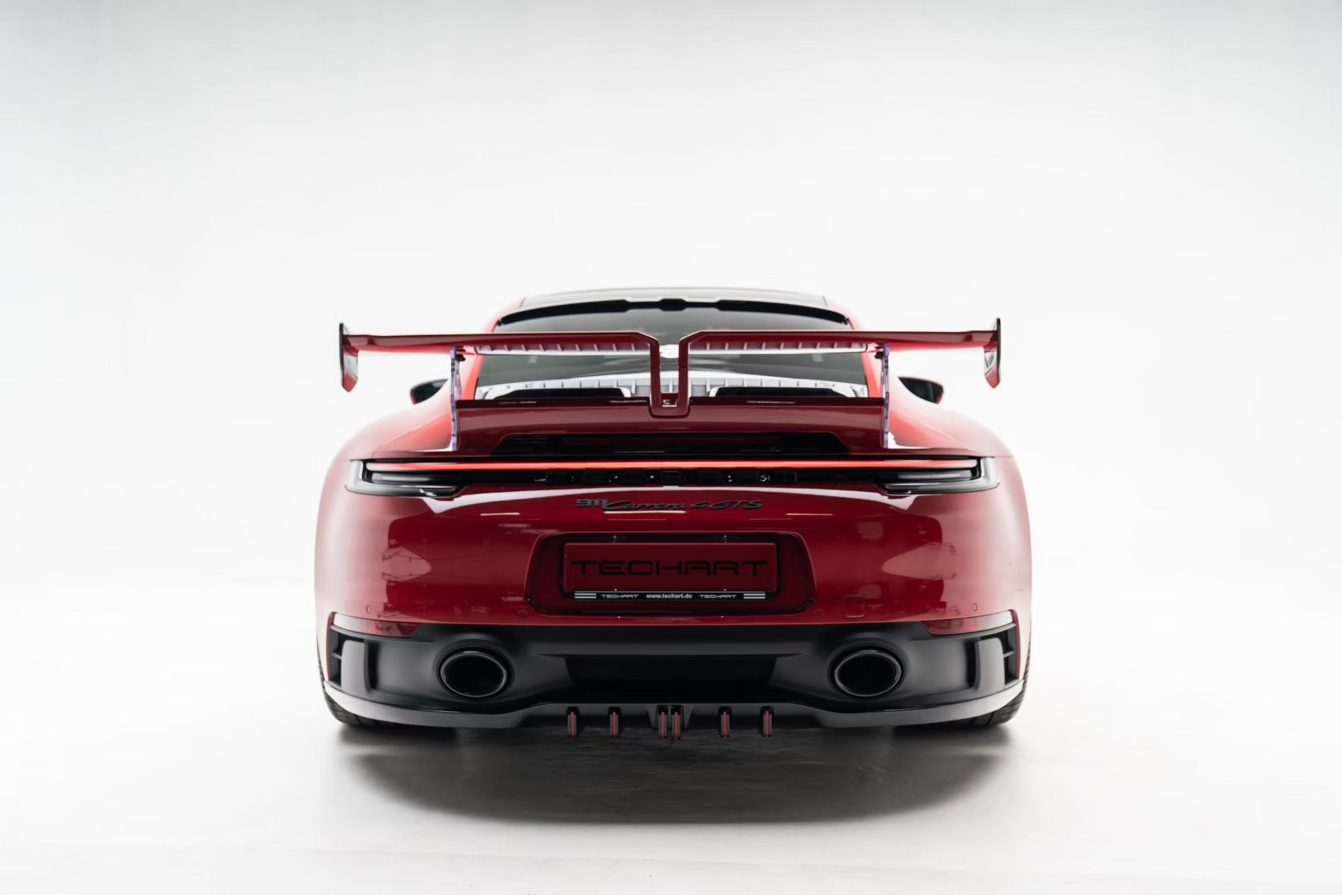 The lower rear is dominated by the Techart Rear Diffusor, which spreads to both sides of the rear apron. Five diffusor fins help to reduce the aerodynamic lift and can be individually color matched.