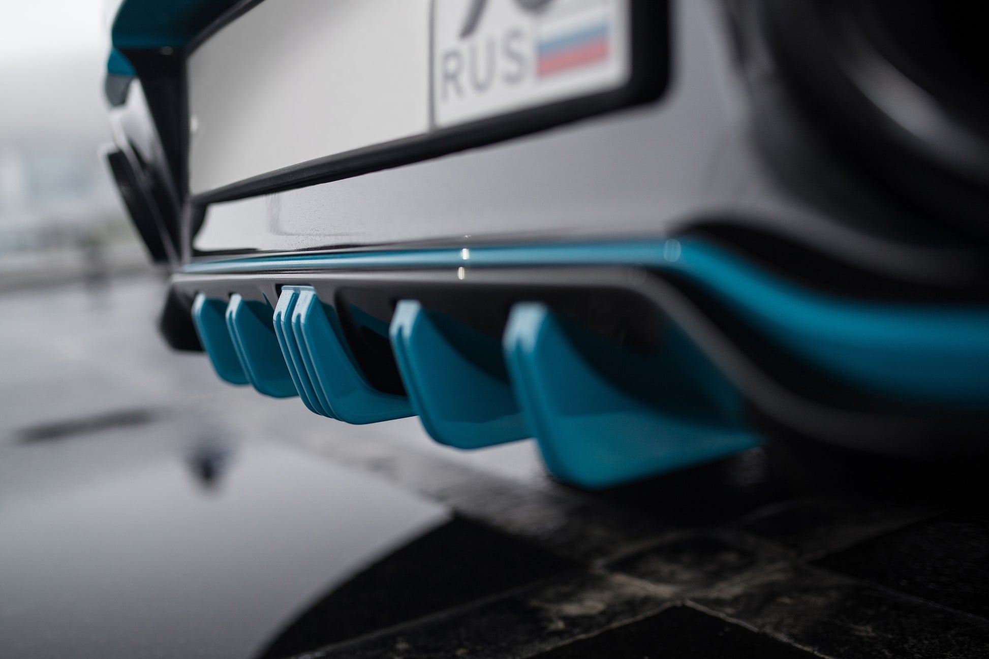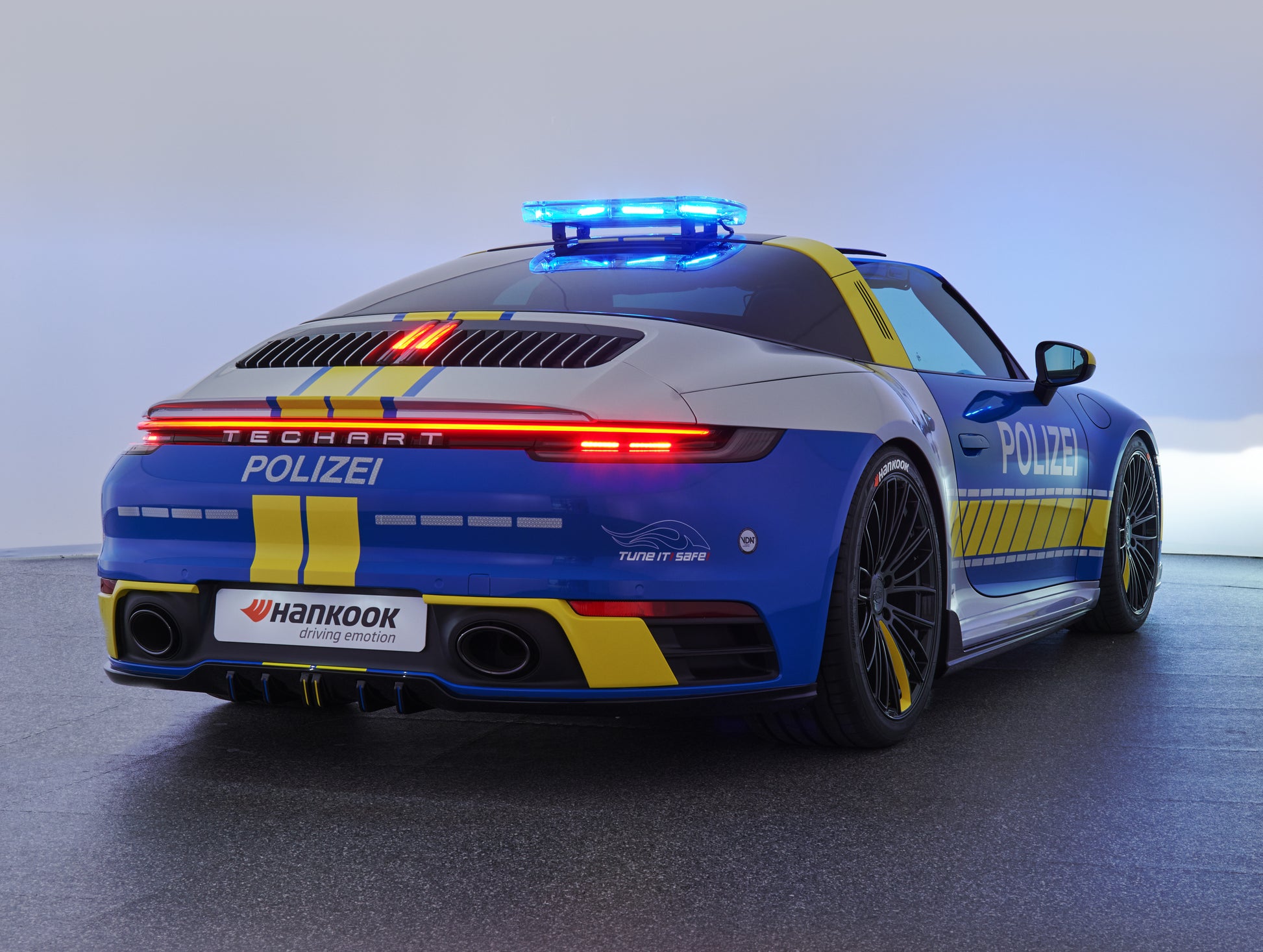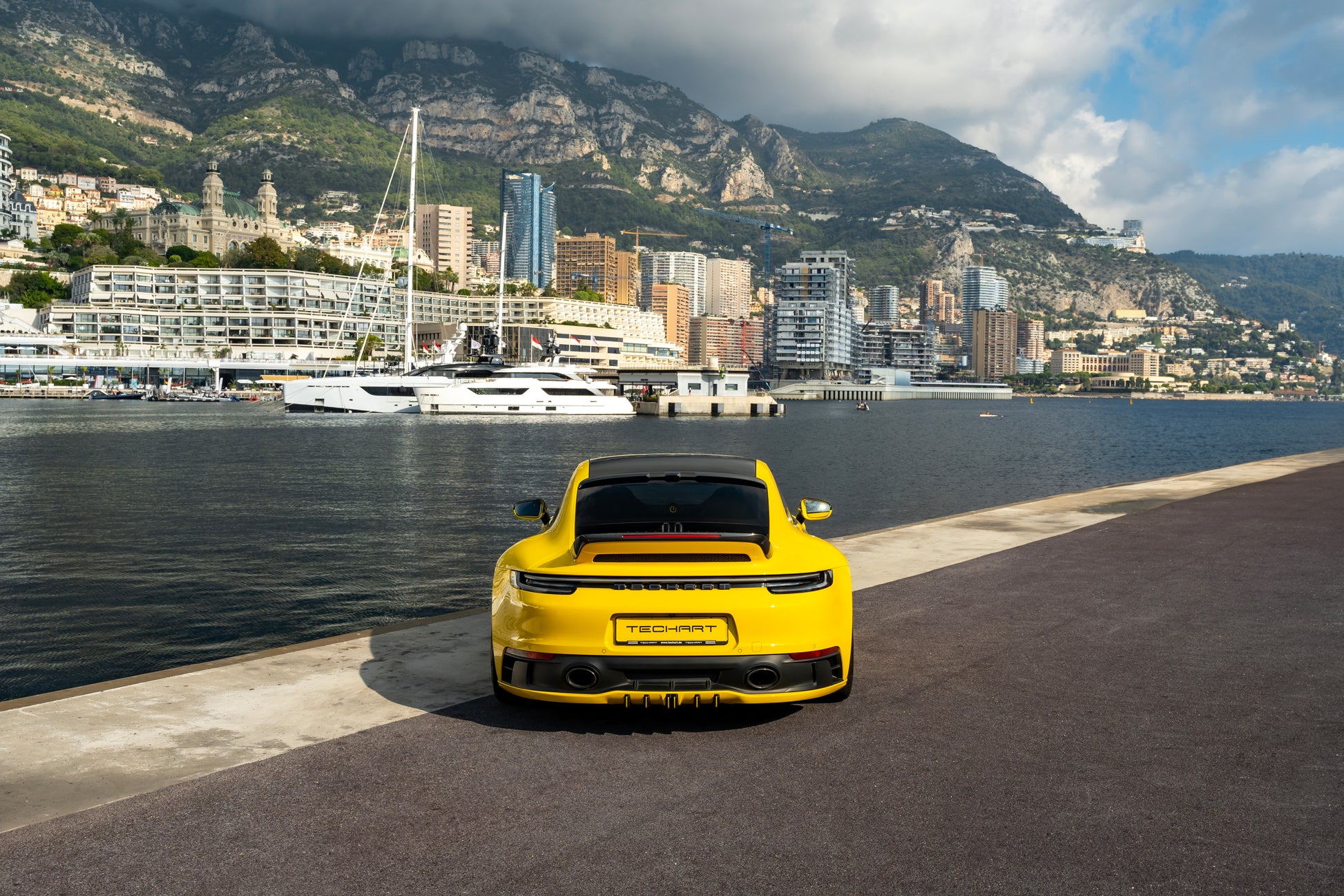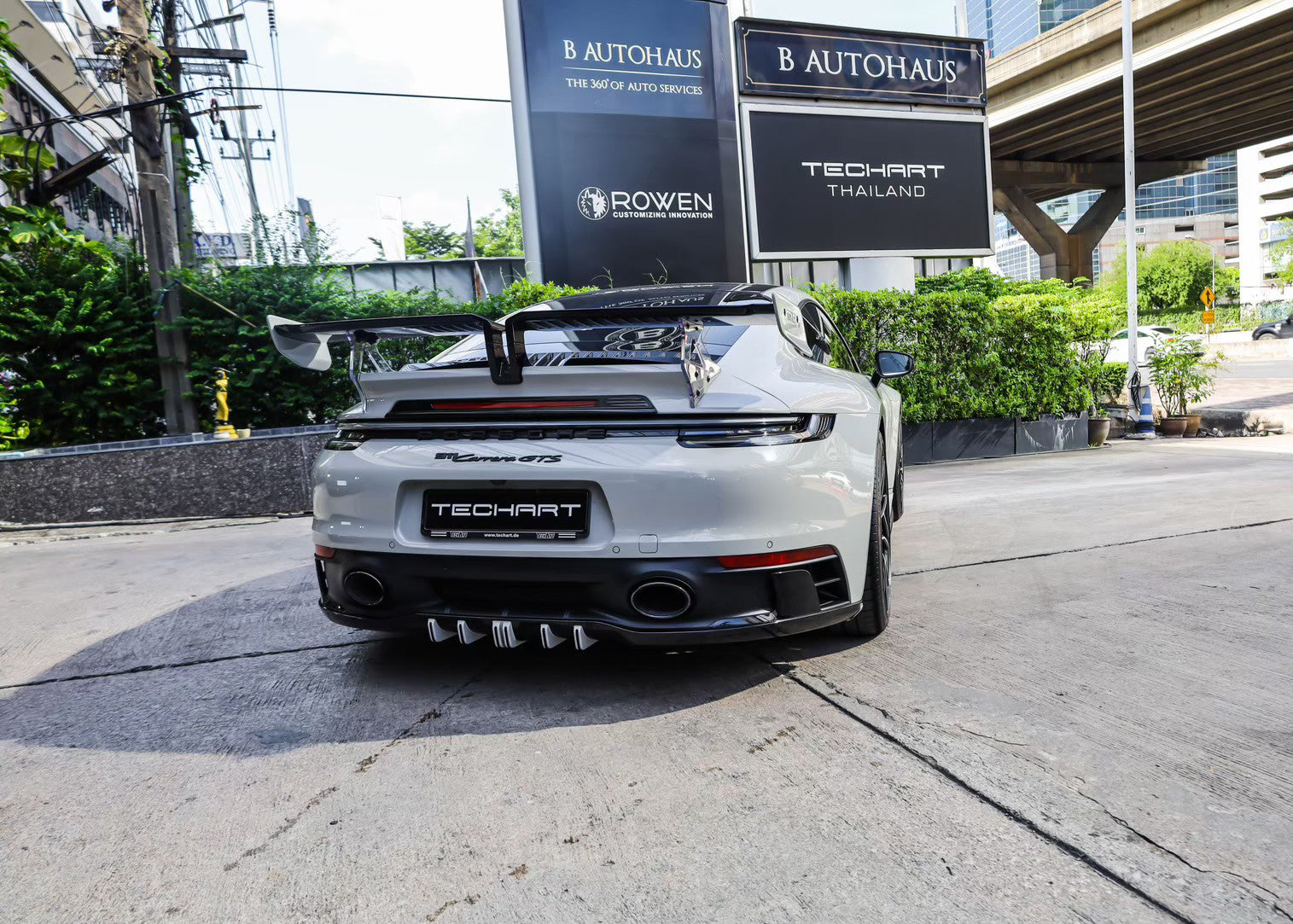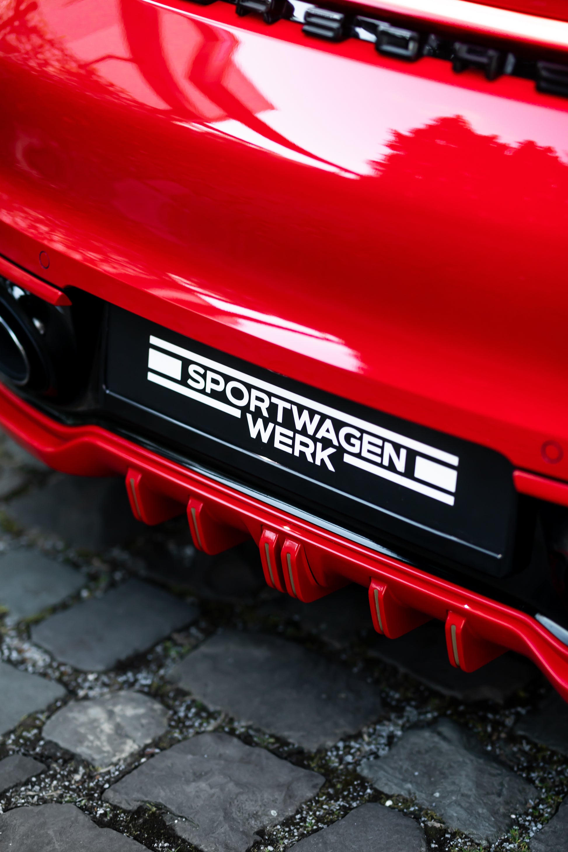The lower rear is dominated by the Techart Rear Diffusor, which spreads to both sides of the rear apron. Five diffusor fins help to reduce the aerodynamic lift and can be individually color matched.