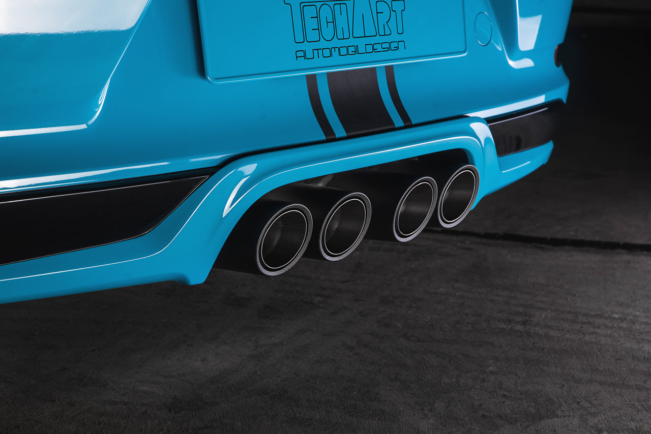 The valve-controlled four-flow TECHART sport exhaust. It includes a TECHART silencer with dynamic exhaust flap adjustment and electronic valve control management.