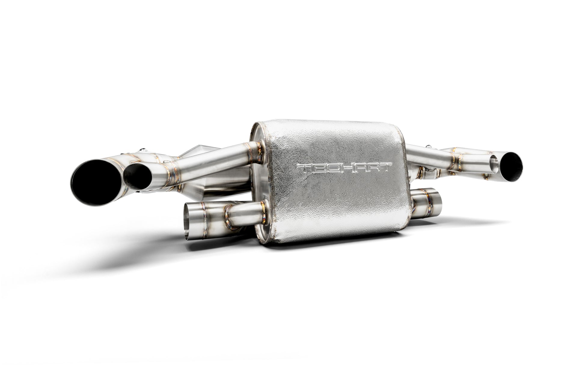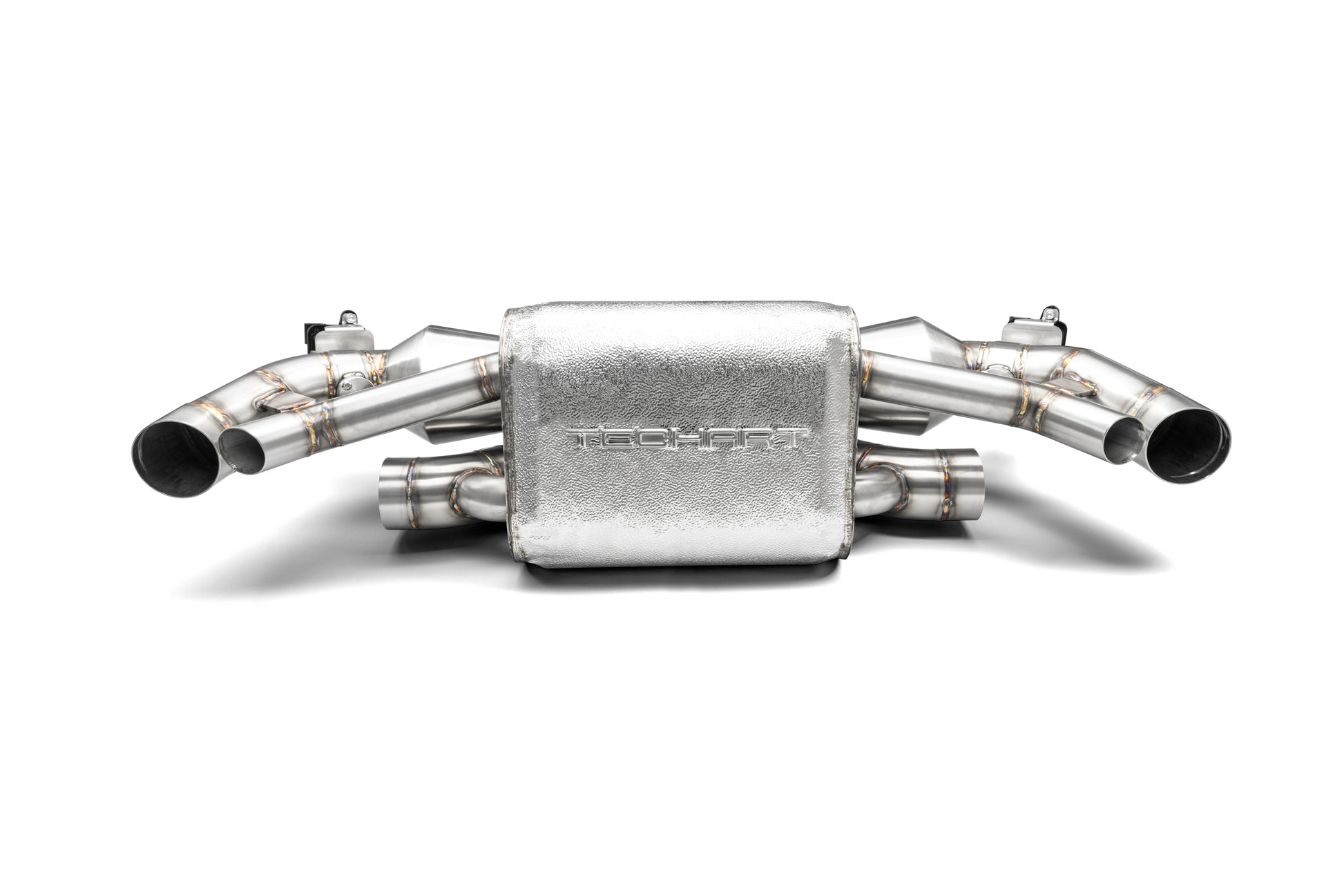 The TECHART sports exhaust system completes the emotional individual driving experience. Dynamic exhaust valves create an impressive soundscape which is also adjusted in accordance to the selected driving mode. This allows you to easily switch from standard power and sound to increased performance combined with sporty driving sound whenever you're in the mood.