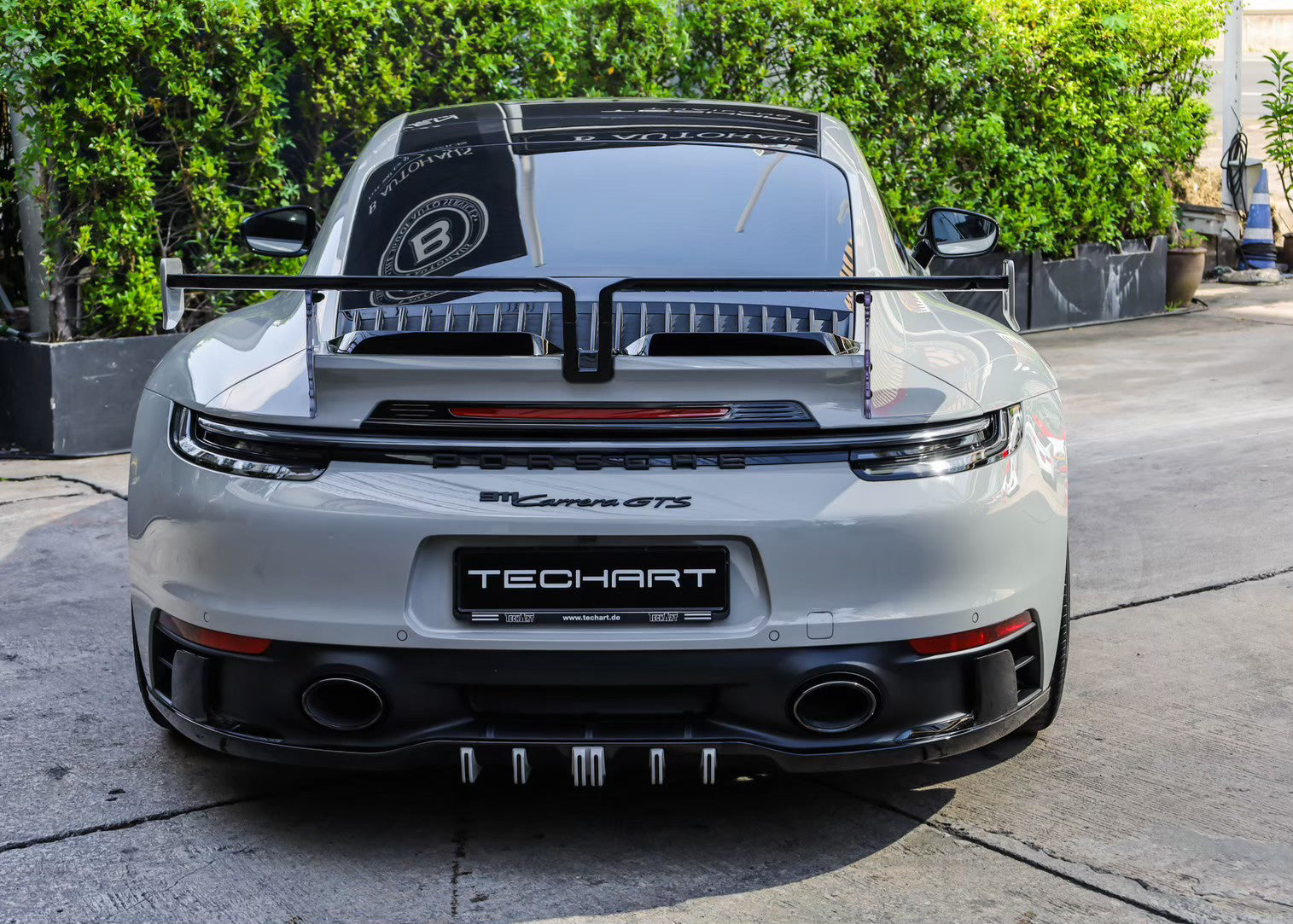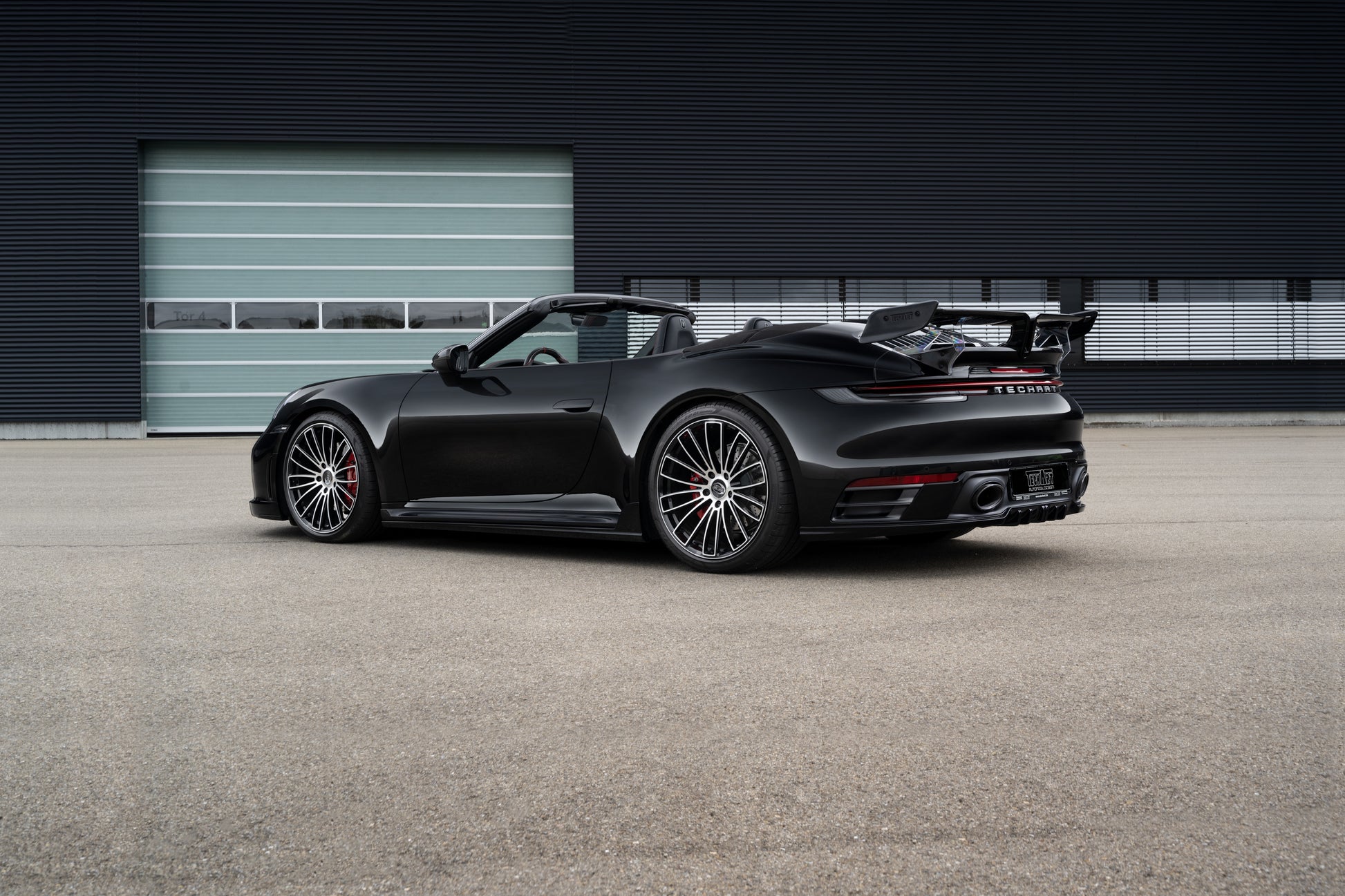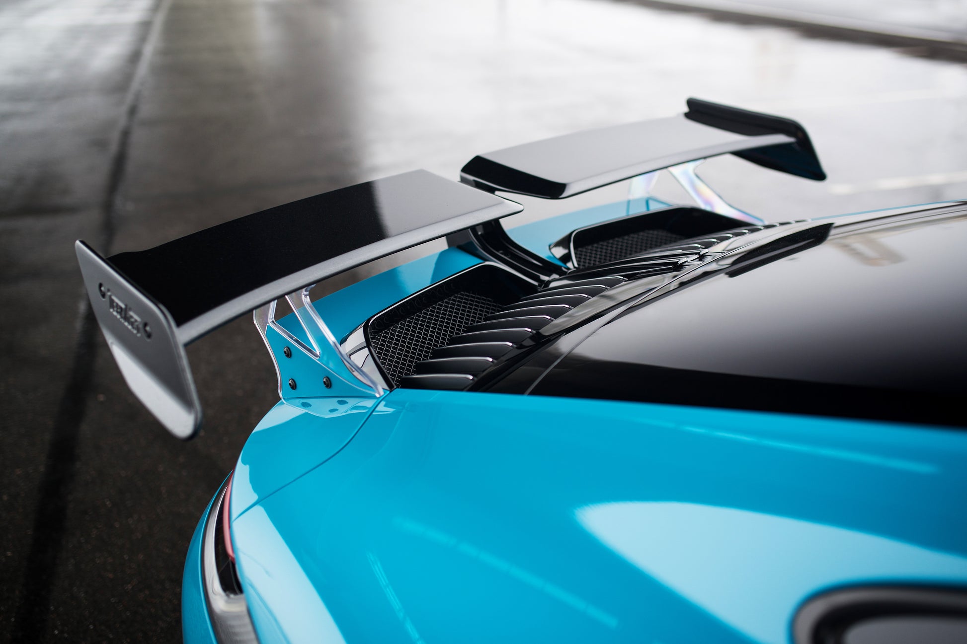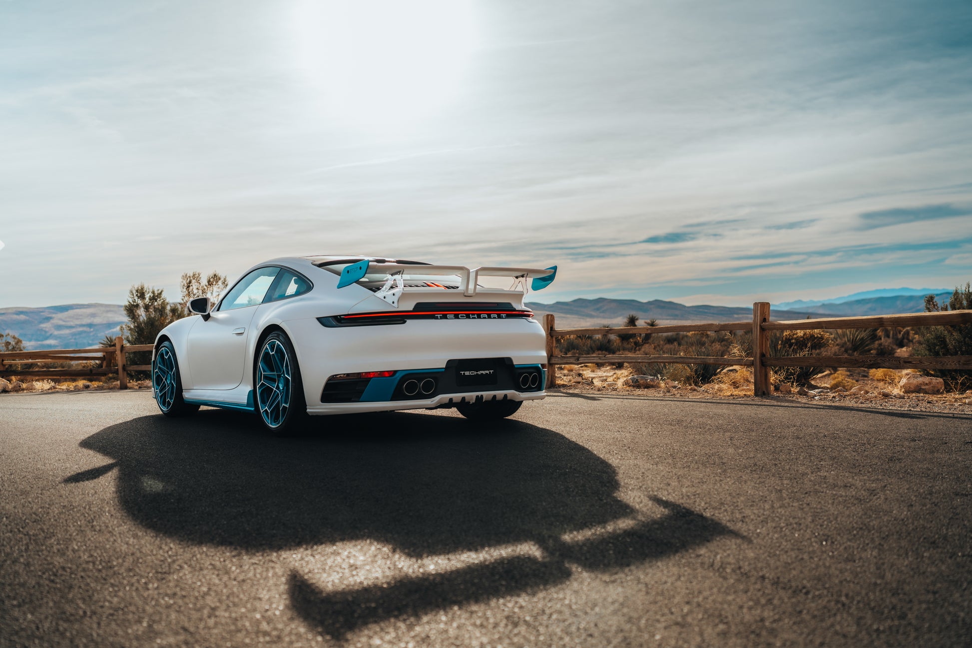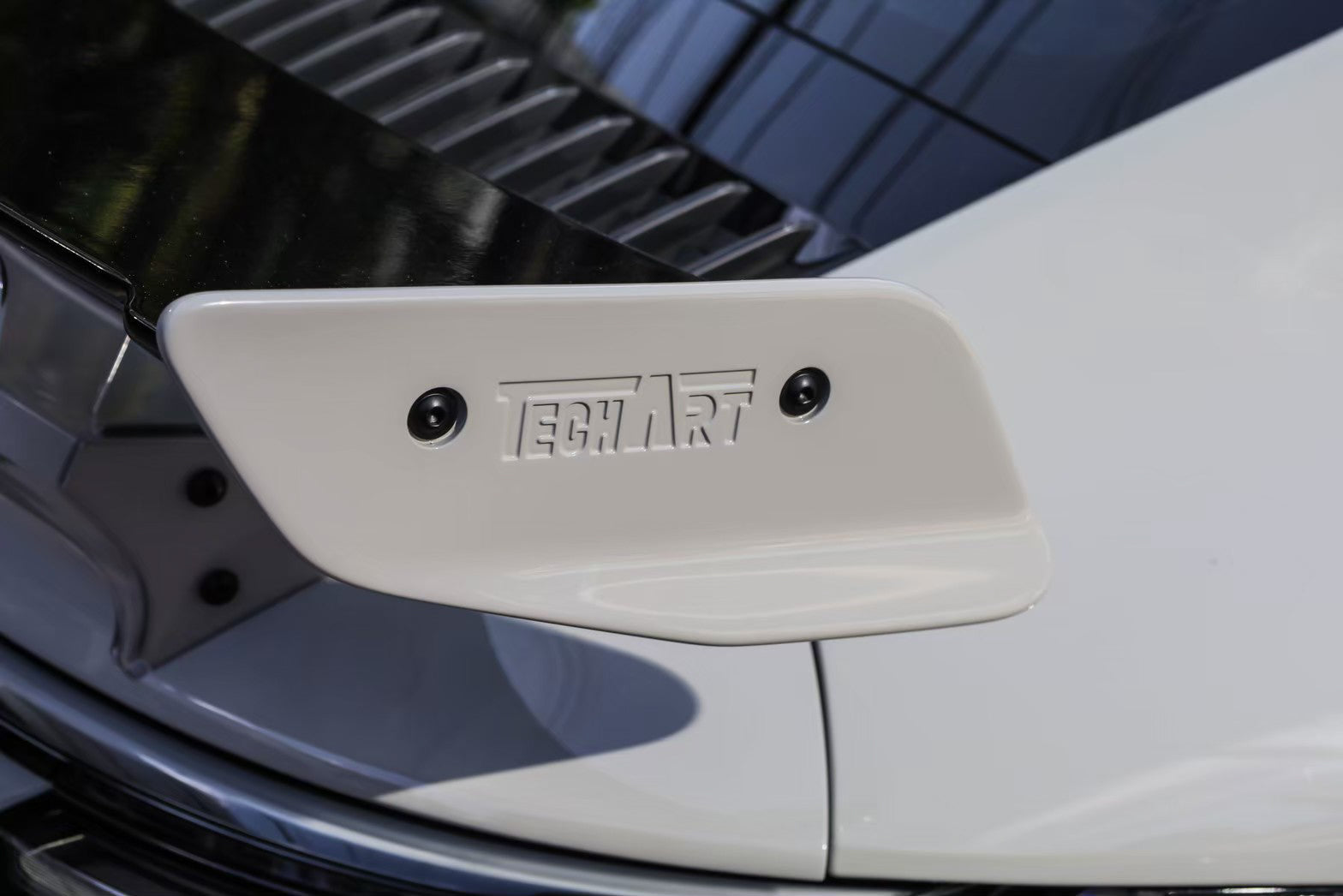 The transparent and high-tensile polycarbonate allows the rear wing to rest like a sculpture on the engine cover. This cover has also been redesigned for the new TECHART Rear Spoiler II. It incorporates two air intakes as well as an additional braking light.
