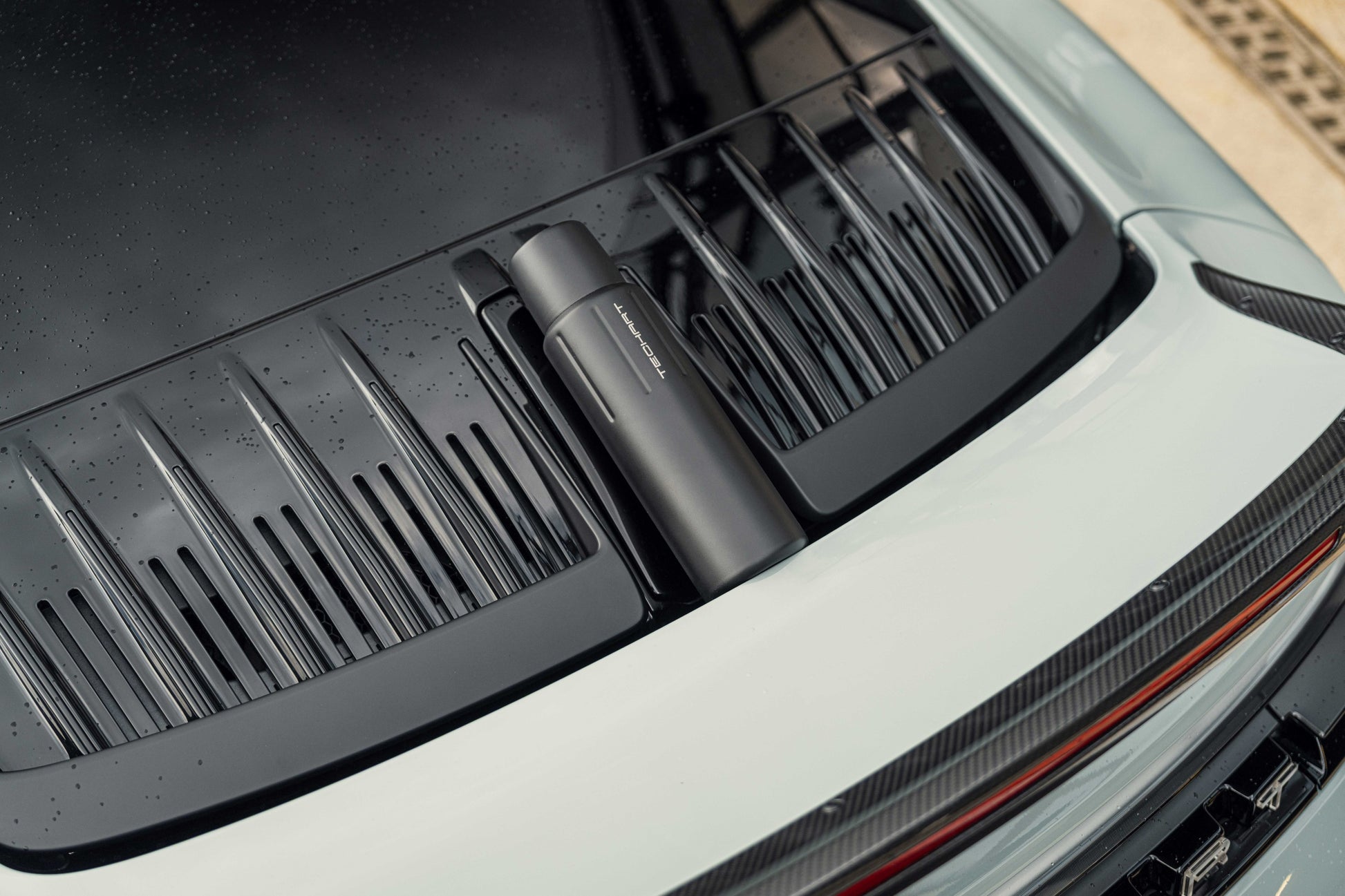 Robust and stylish stainless steel thermos flask with a 700 ml capacity. The satin black finish and precisely engraved TECHART lettering give the bottle a striking, high-quality look. It reliably keeps drinks hot or cold – perfect for long workdays, road trips, or everyday use.